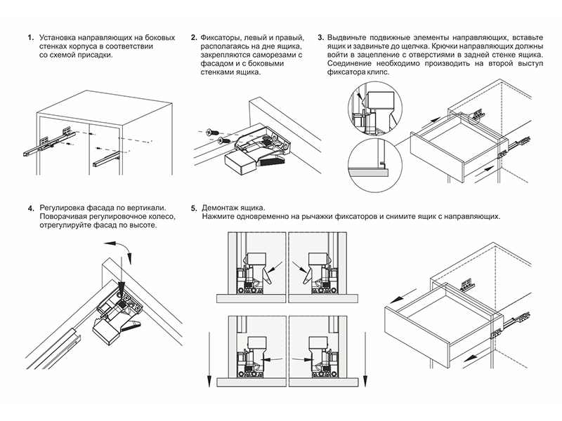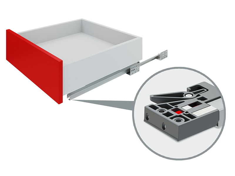 Направляющие обеспечивают комфортное движение, лёгкое открывание от нажатия на фасад и имеют защиту от случайного открывания «на себя» на протяжении 100 открываний.