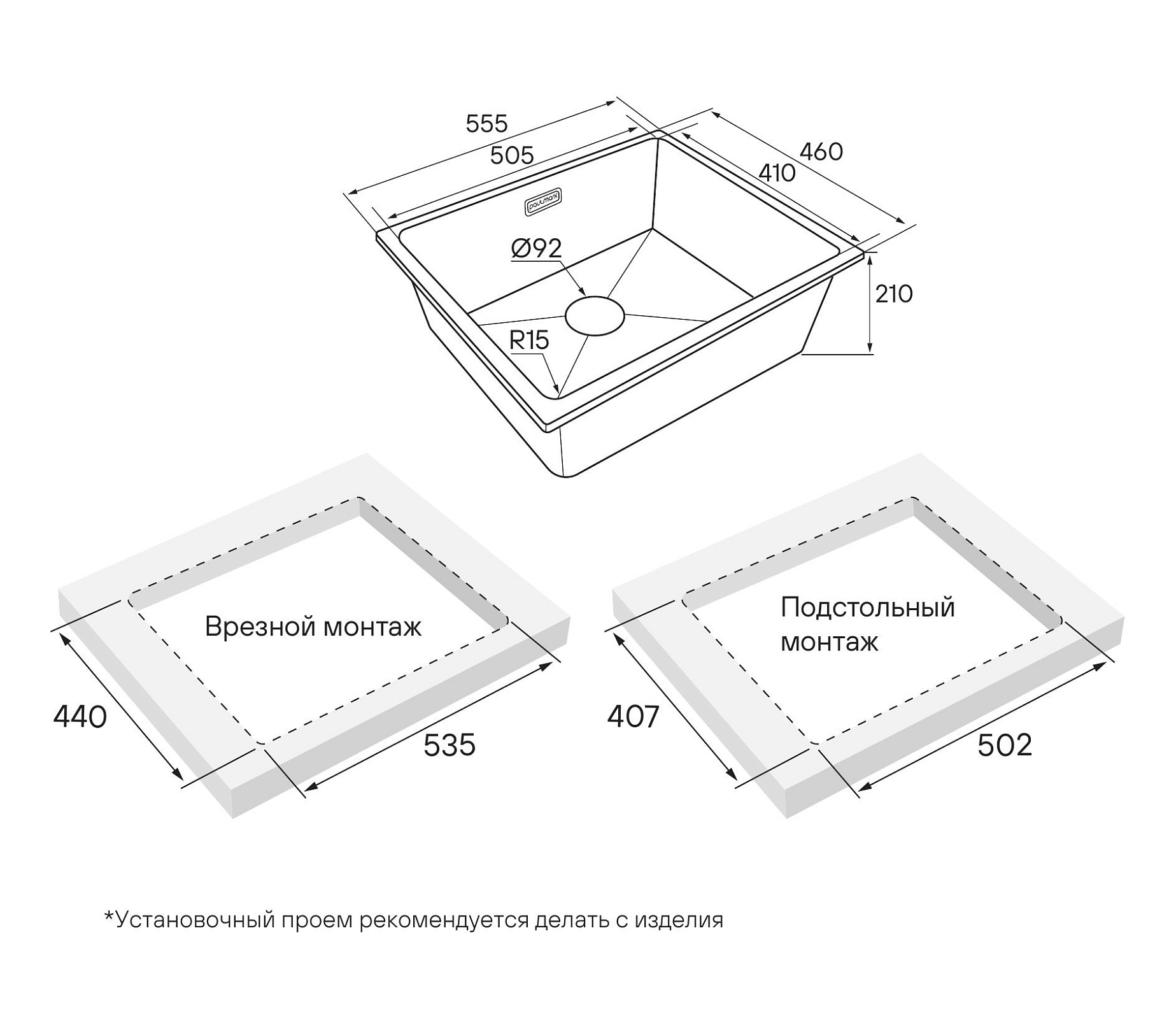 Мойка Paulmark LUMI, LU55-BL, 555х460х210 мм, черный, в комплекте