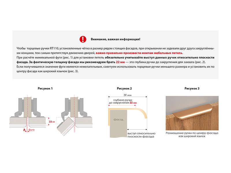 RT110 подходит для установки на фасады толщиной до 18 мм и крепится накладным способом, что значительно облегчает установку и не требует дополнительной работы с торцом.
