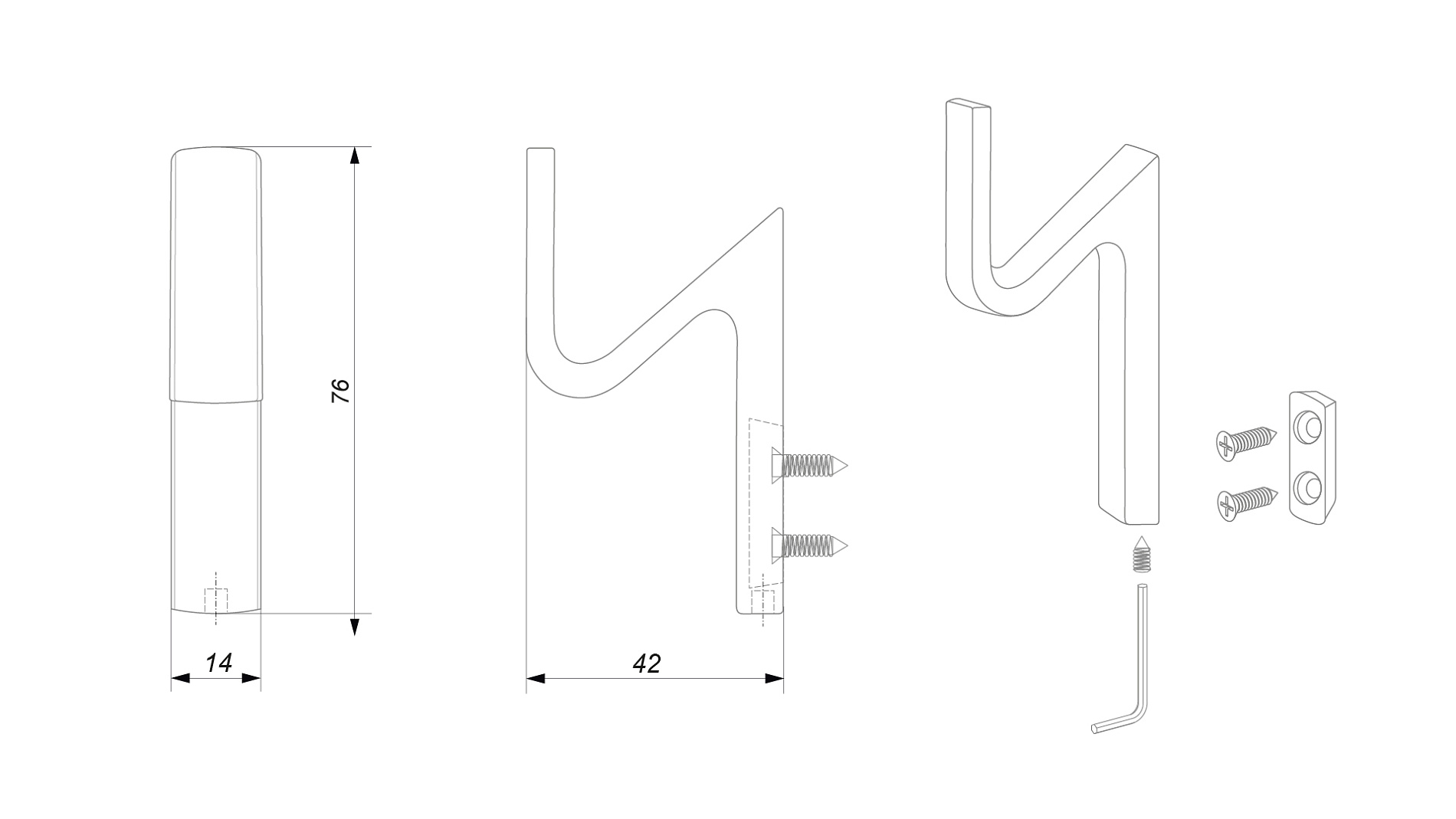 В комплект входит: крючок, крепёжная планка, саморезы 4х18 (2 шт.), крепёжный винт (1 шт.), шестигранный ключ.