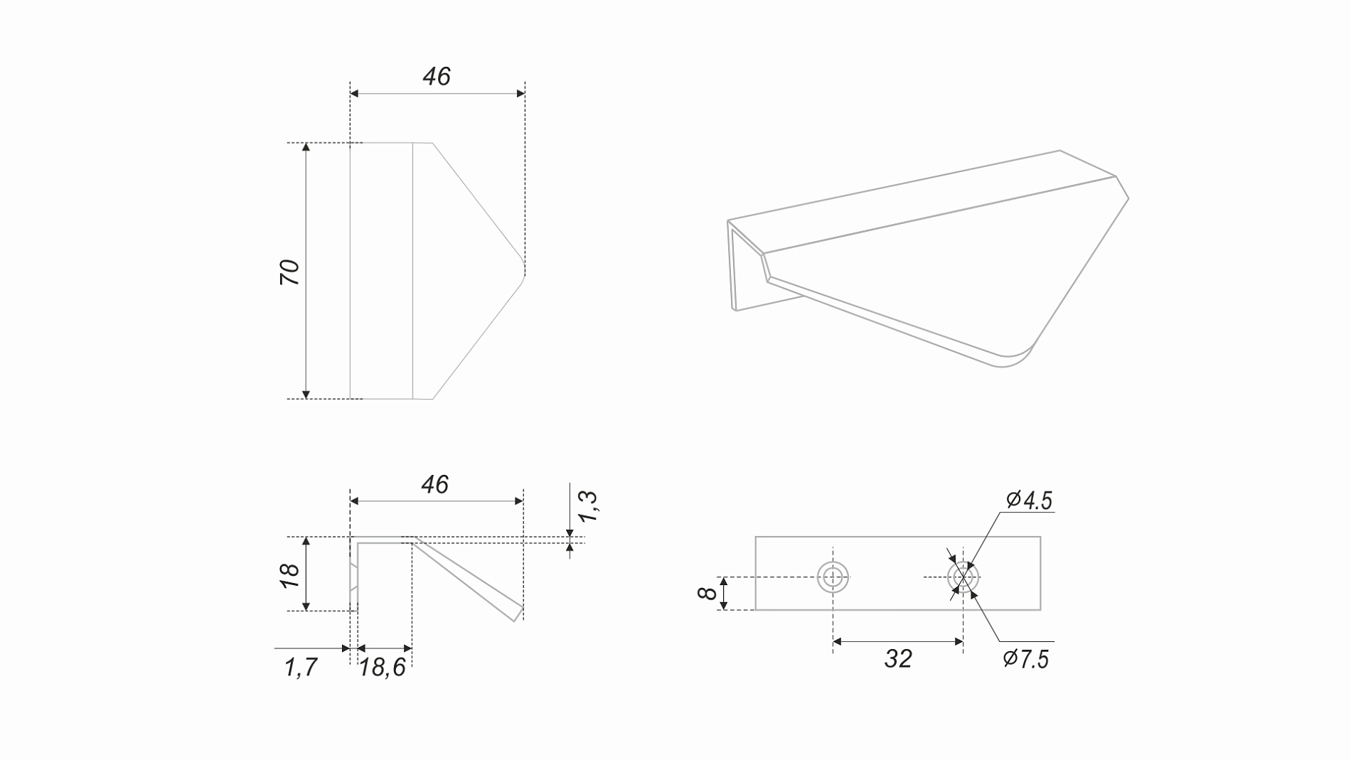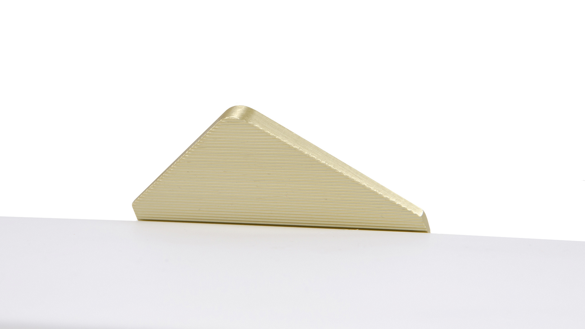 ICON RT014 — торцевая ручка из алюминия, с геометричным выступом в форме треугольника. Для удобства захвата на ручках увеличен отступ язычка, а на его внутренней стороне предусмотрено рифление. Устанавливается наложением, подходит для фасадов толщиной до 18 мм.