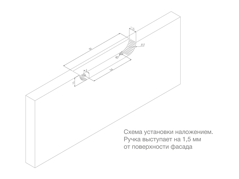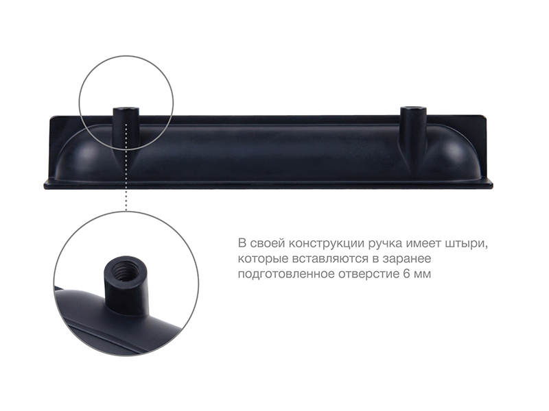 Конструкция модели имеет специальные штыри, которые вставляются в заранее подготовленное отверстие в торце фасаде на его внутренней стороне с размером 6 мм. Для надёжной фиксации ручки с фасадом применяется клей (приобретается отдельно в специализированных магазинах в зависимости от материала фасада).