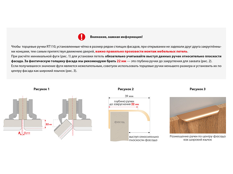 RT110 подходит для установки на фасады толщиной до 18 мм и крепится накладным способом, что значительно облегчает установку и не требует дополнительной работы с торцом.