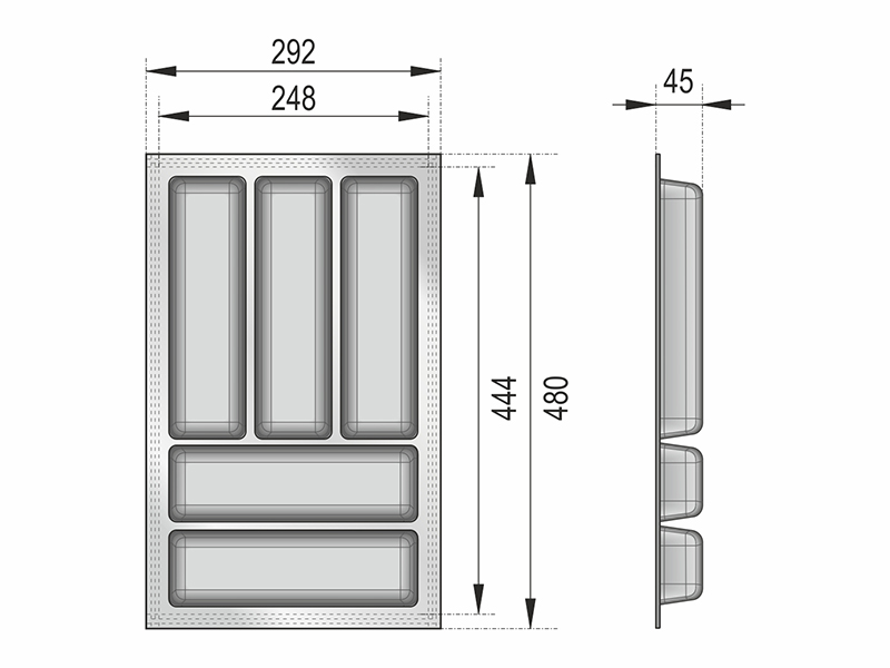 Базовая глубина блока — 480 мм. При необходимости её можно уменьшить до 444 мм с помощью специальных насечек на обратной стороне лотка. Ширина блока также корректируется в диапазоне 292 – 248 мм.