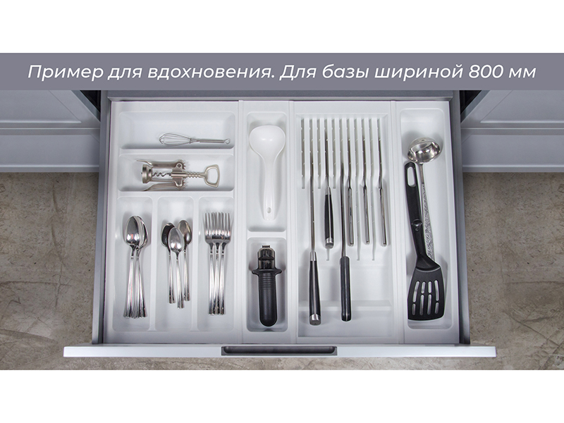 Ассортимент лотков BLӦKI позволяет собрать практичный индивидуальный органайзер в выдвижные ящики до 1200 мм.
