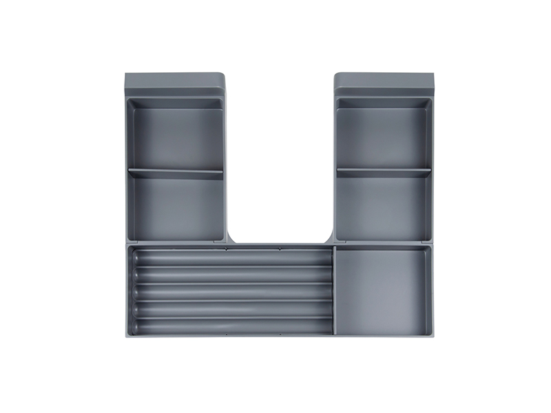 Модель оснащена специальными делителями, которые позволяют организовывать пространство и делить его на разные отсеки внутри поддонов под определённый размер для хранения: расчёсок, салфеток, баночек и других небольших предметов. Для среднего отсека в комплекте предусмотрена рифлёная вставка для зубных щёток.