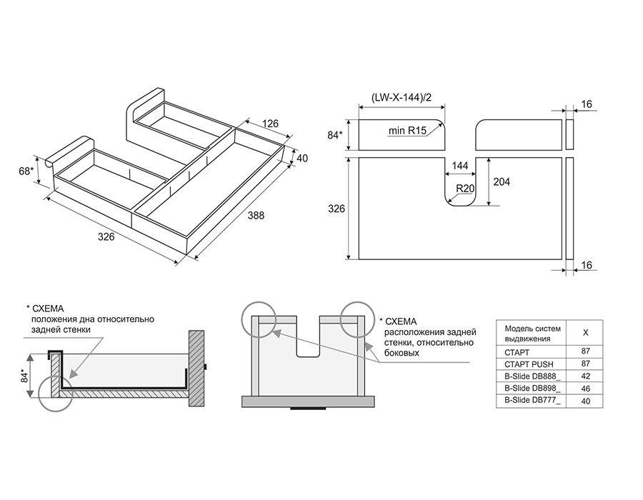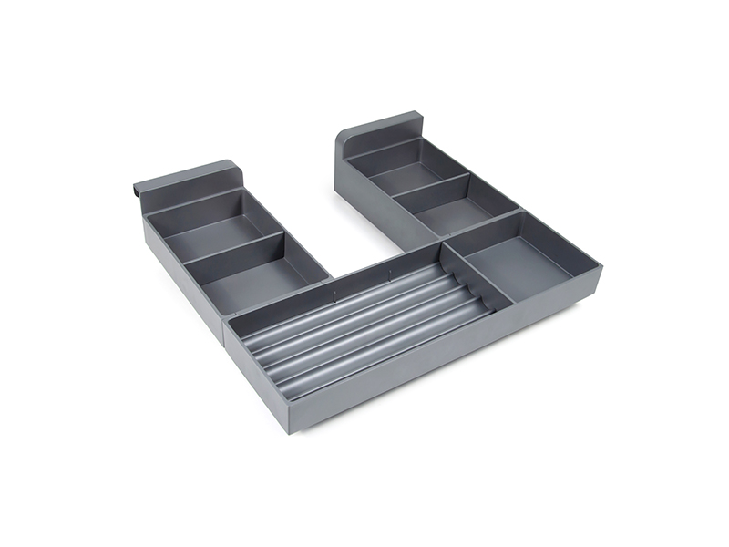Конструкция органайзера — самостоятельный держатель задней стенки, а внутренние стенки, которые идут в комплекте — заполнят пространство внутри мебельного ящика. Торцы отверстия при этом будут закрыты конструкцией боковых деталей SBH70, что позволит сохранить эстетичность изделия.