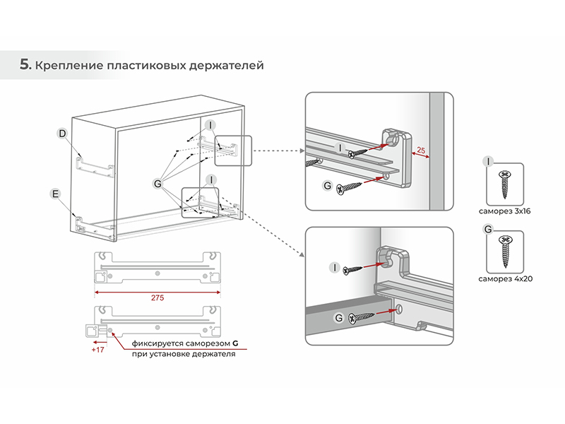 Регулируемый нижний держатель допускает установку в короб с внутренней глубиной от 280 мм и монтаж задней стенки 4 мм в паз.