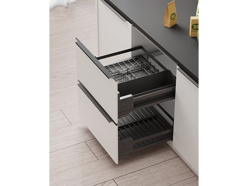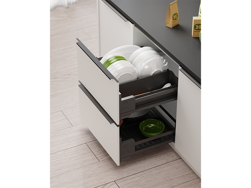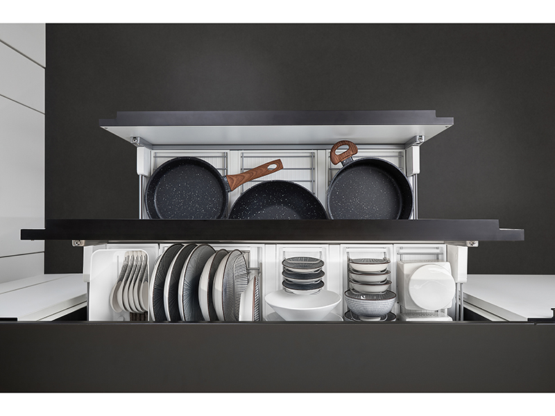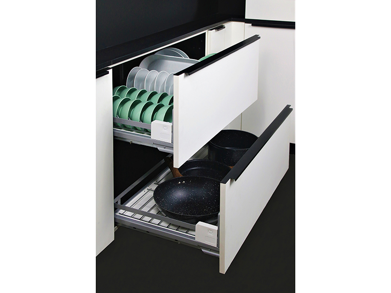 Удобные комплекты для организации хранения в выдвижных механизмах позволяют выбрать оптимальный вариант под ваши задачи: большие тарелки, много чашек или универсальный набор для хранения разного типа посуды.