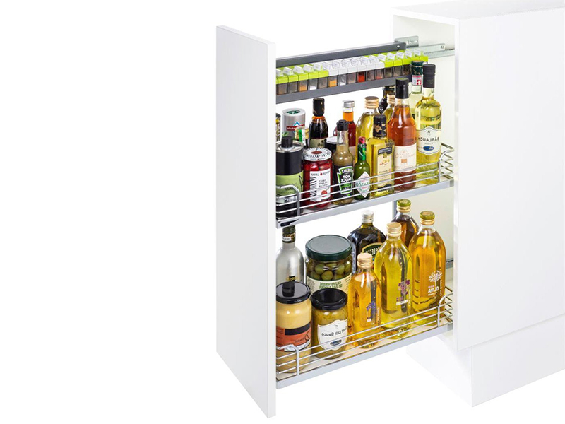 Механизм для хранения и бокового доступа к содержимому в нижних тумбах. Крепится к боковине корпуса, слева или справа. Все содержимое легко выдвигается на передний план. Полка для специй предоставляет дополнительное пространство для хранения мелких предметов. Плавное закрывание обеспечивается демпферами.