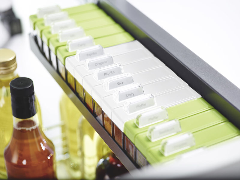 Механизм для хранения и бокового доступа к содержимому в нижних тумбах. Крепится к боковине корпуса, слева или справа. Все содержимое легко выдвигается на передний план. Полка для специй предоставляет дополнительное пространство для хранения мелких предметов. Плавное закрывание обеспечивается демпферами.