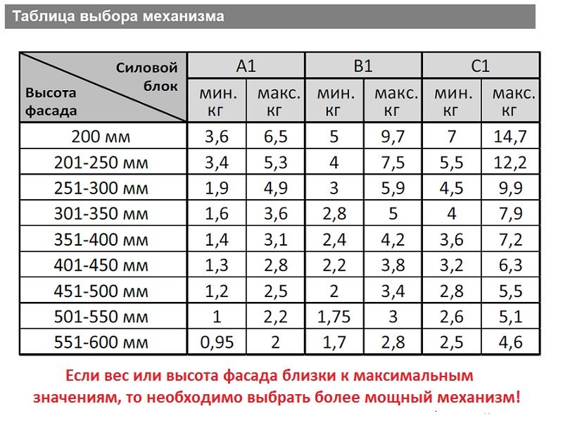 Выбор механизма осуществляется согласно таблицы подбора исходя из веса и высоты фасада. Если вес или высота фасада близки к максимальным, то необходимо выбрать более мощный механизм