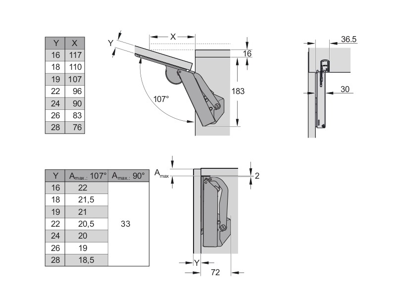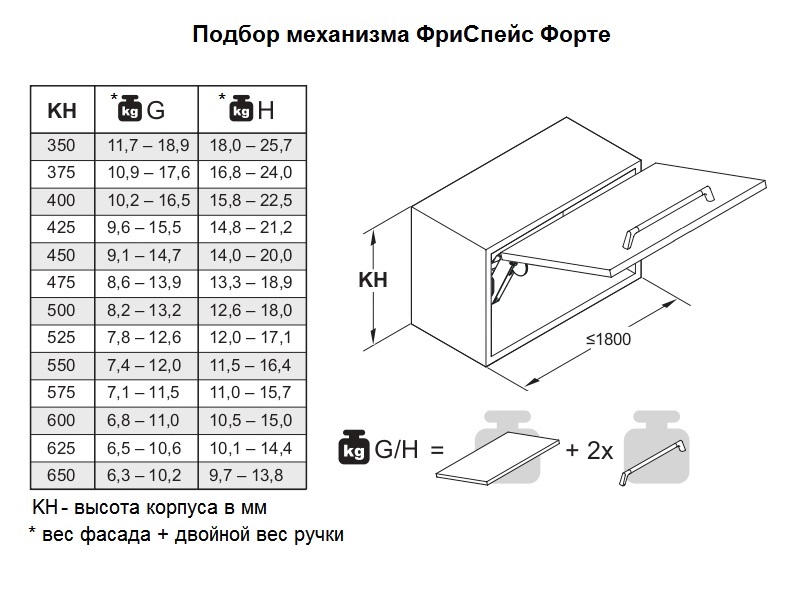 для фасадов весом от 6.3 до 18.9 кг (см. таблицу подбора) и высотой от 350 до 650 мм.