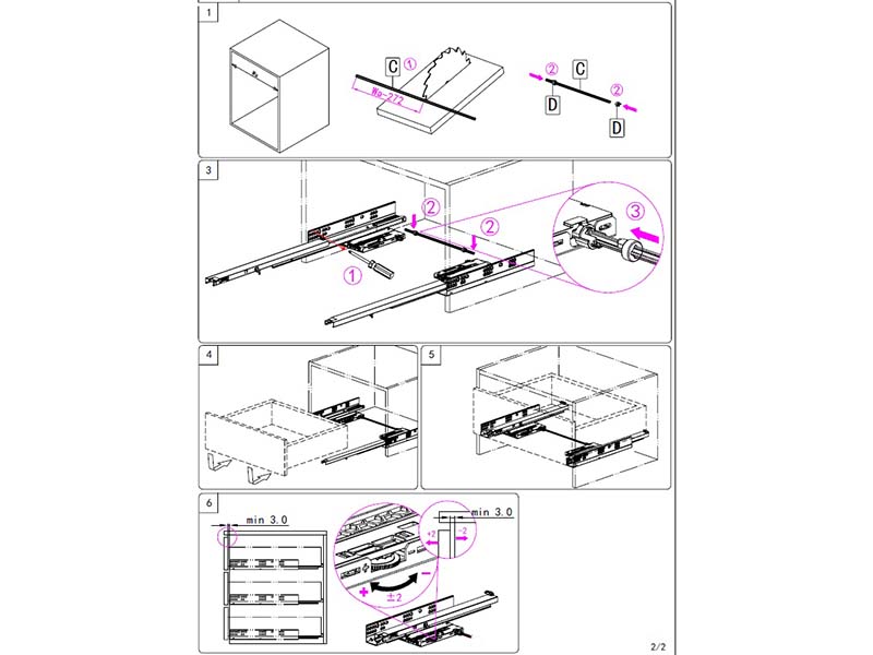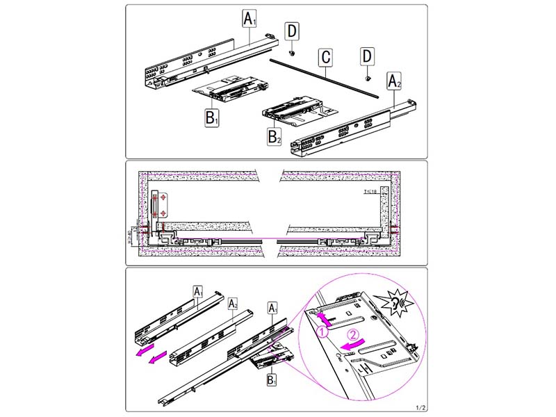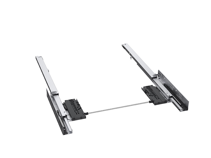 Комплект направляющих скрытого монтажа для деревянных выдвижных ящиков, с регулируемыми держателями фасада.