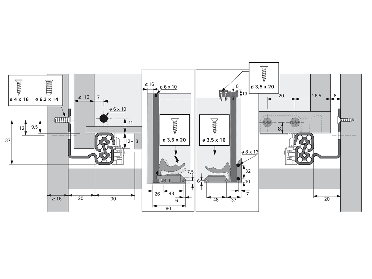 Направляющие для деревянных ящиков полного выдвижения Quadro V6 с механизмом Push to open